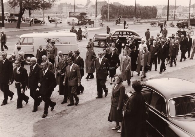 Burgemeester Adolf VAN GLABBEKE wandelt met een groep naar het dd. stadhuis (huidig Gerechtshof).Op de achergrond het Hazegras met links het (nog lege) tweede handelsdok.Een agent staande op een verhoog regelt het verkeer…