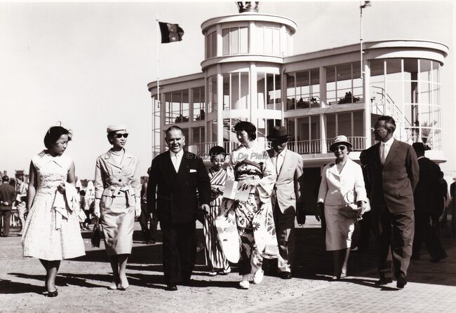 Burgemeester Adolf VAN GLABBEKE met Japanse genodigden op de Wellingtonrenbaan. Uiterst rechts : schepen François VAN CAILLIE