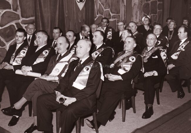Burgemeester Adolf VAN GLABBEKE, eerste van rechts op de tweede rij, tussen de andere ridders van de Confrérie van de Rat Mort in de Ridderzaal van het Casino-Kursaal.