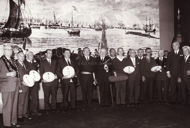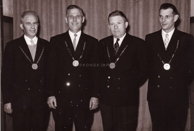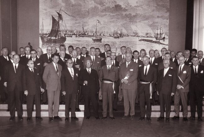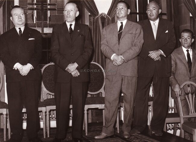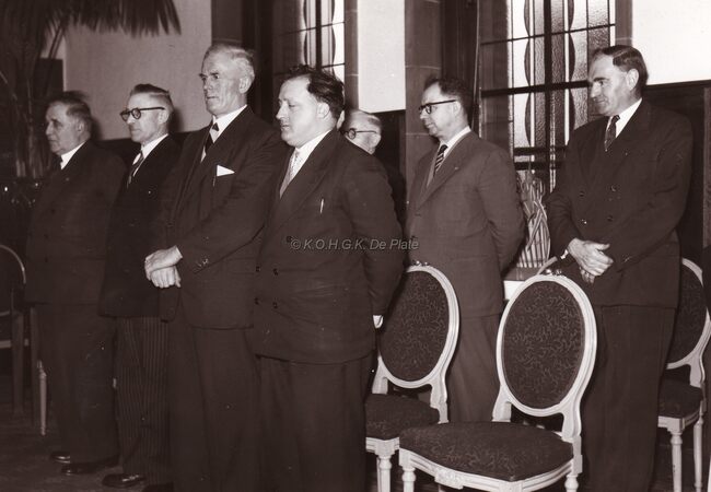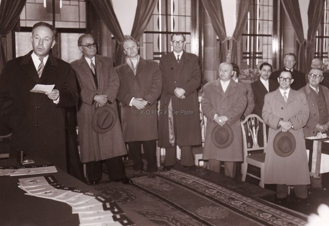 Ontvangst van een boogschuttersgilde op het stadhuis.Centraal John LAUWEREINs,schepen dd. burgemeester,helemaal rechts Maurice QUAGHEBEUR,notaris en schepen.