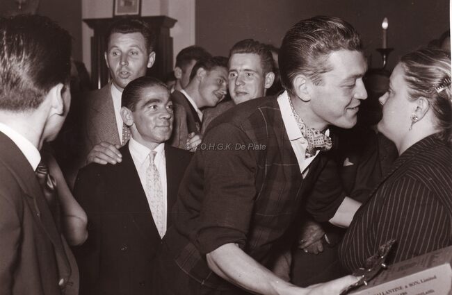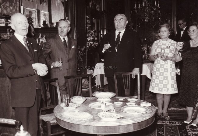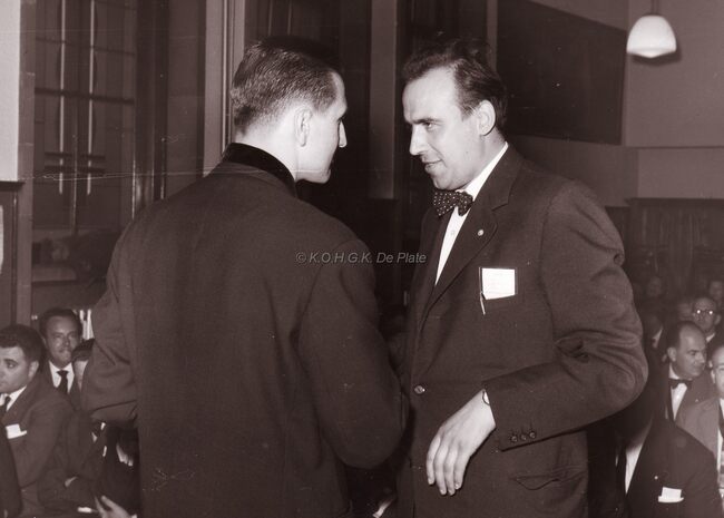 Middaguur. De receptie. Burgemeester Adolf Van Glabbeke in het gezelschap van fotograaf Maurice Antony (links).