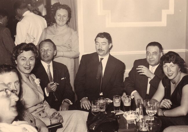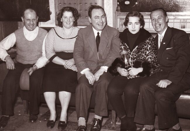 Aan het klavier Joseph Berden, ook orgelist van de Sint-Jozefskerk, tijdens een banket van het SEO-personeel in het Hotel Wellington. Achter hem Florimond Corsellis, dirigent van de stadsharmonie, en zangeres Jacqueline…