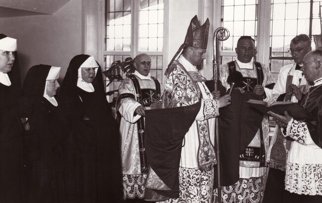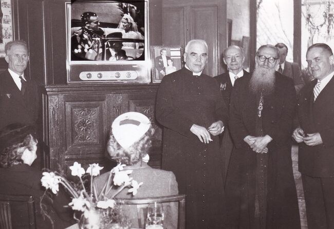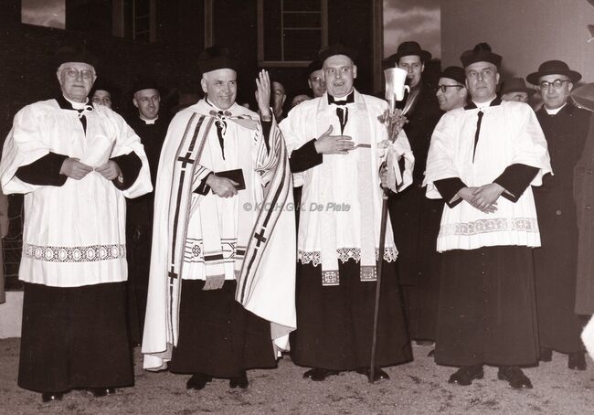 Deken BUTAYE, tweede van links tijdens een kerkelijke viering, op de achtergrond Jan PIERS latere burgemeester. Inhaling van pastoor Valère Adriaen op de Sint-Godelieveparochie. Hij was er pastoor van 1958 tot 1972.