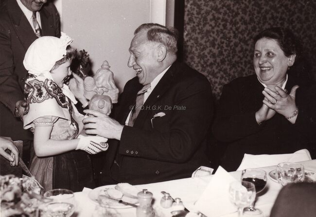 Sebastiaan BOUDOLF, socialistisch gemeenteraadslid en voorzitter OCMW ontvangt op een banket een geschenk (beeldje van een paardenvisser). Naast hem zijn echtgenote Maria AELEN