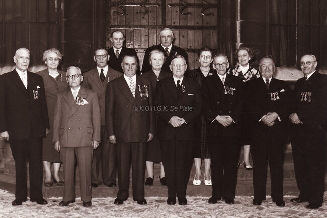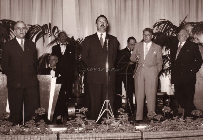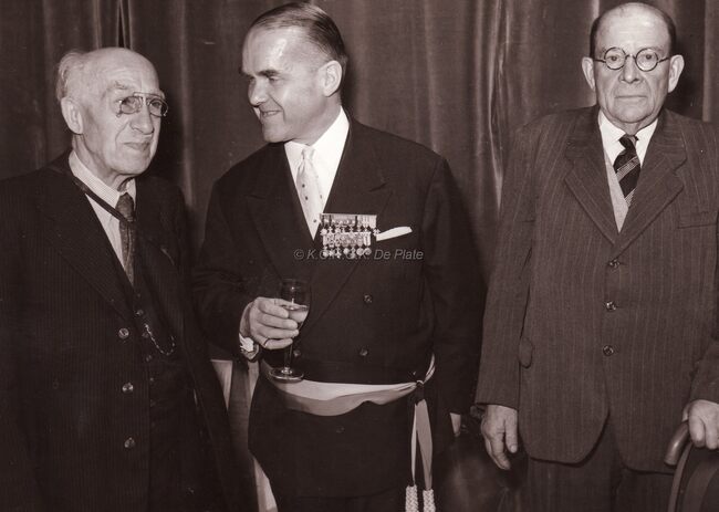Burgemeester August Plovie van Bredene op een ontvangst op het dienstdoend Oostends Stadhuis (Gerechtshof). Hij was ook leraar lichamelijke opvoeding in het Koninklijk Atheneum van Oostende. Eerste rij, tweede links, de…