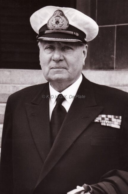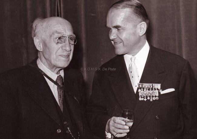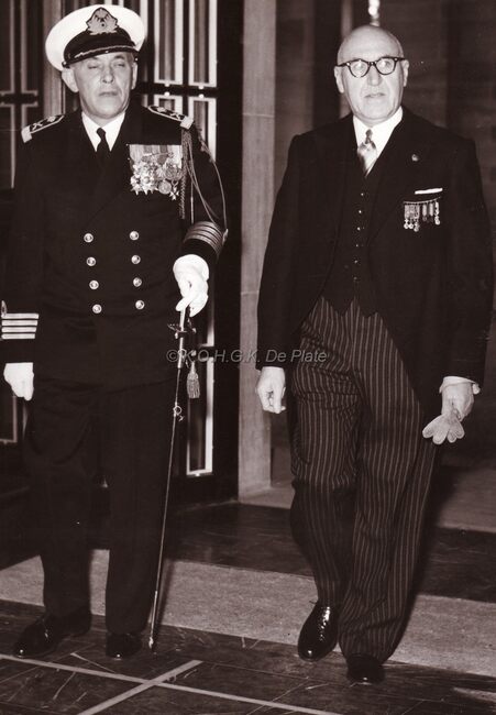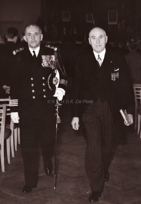 Kapitein ter Zee Delforge en Robert Elleboudt, voorzitter van het "Verbond der Oudstridersmaatschappijen van Oostende " (VOSMO)