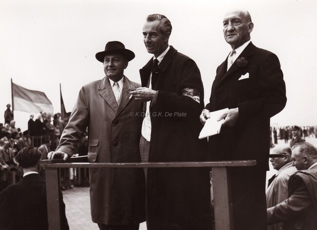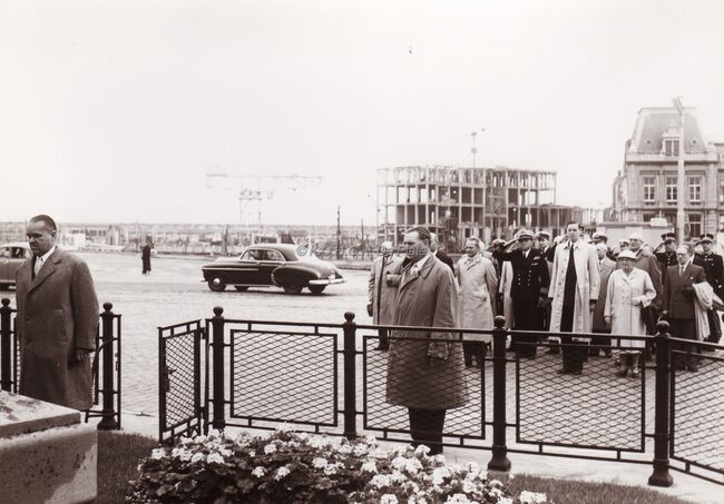 Burgemeester Adolf VAN GLABBEKE bij een huldiging (11 november ?) aan het monument der gesneuvelden van beide wereldoorlogen aan het Sint Petrus en Paulusplein.Op de rij der notabelen staat Jan PIERS toekomstig…