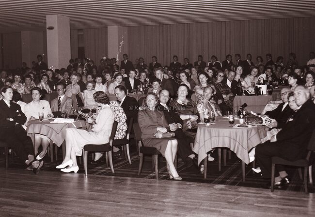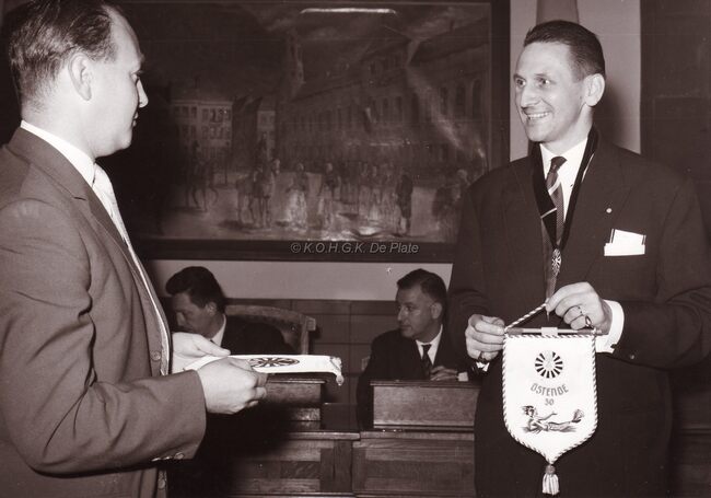 Zicht op zaal tijdens een huldiging in het Casino- Kursaal. Aan de tafel vooraan rechts zit burgemeester Adolf VAN GLABBEKE en schepen Maurice QUAGHEBEUR, aan de tafel ernaast Jan PIERS toekomstig burgemeester en zijn…