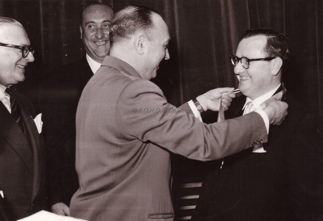 Vereremerking in de kursaal (?) van mevrouw BOGAERT en onbekende heer. Rechts Theo DEHAENE, liberaal voorman.
