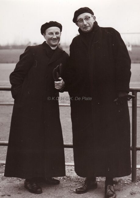 Pastoor VERHELLE (rechts) en confrater BALANCK op het Hermes atletiekstadion, thans (2012) B.L.O.S.O. Jozef VERHELLE werd priester gewijd op 10 juni 1933. Leraar College Menen, 1935. Priester-leraar OLV College, 1936.…