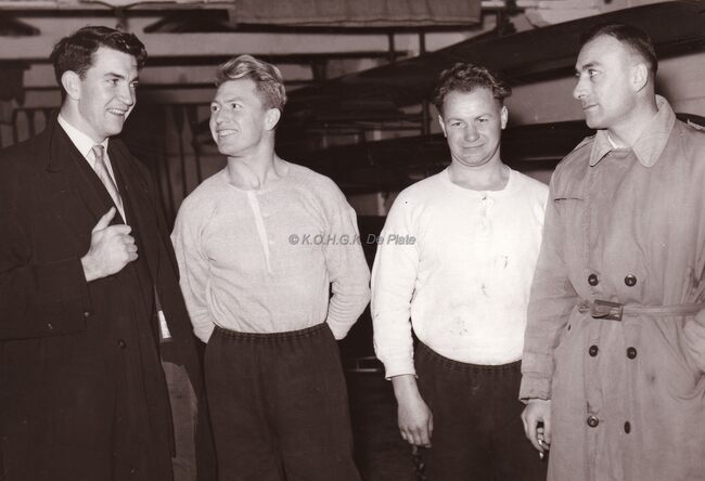 De gebroeders Henri en Fernand Steenacker (centraal) in het gebouw van de Sport Nautique op het Sas. Zij waren uitstrekende roeiers behaalden talrijke Belgische en Europese titels en namen ook deel aan twee Olympiades.…