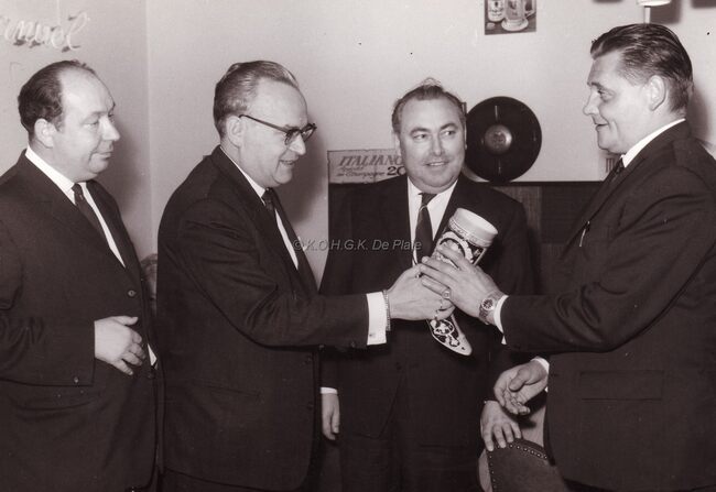 Gustaaf Smets, uitbater van "Het Witte Paard" huldigt een onbekende. Links staat John Hermans, journalist en de tweede van rechts is Henri Degrave, gemeenteraadslid