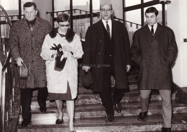 Voetballer Wilfried PUIS (rechts) en zijn echtgenote na een ontvangst op het stadhuis. Links Raymond VANDENBERGHE en naast PUIS, Albert DEVYNCK. Beiden stadsambtenaar.