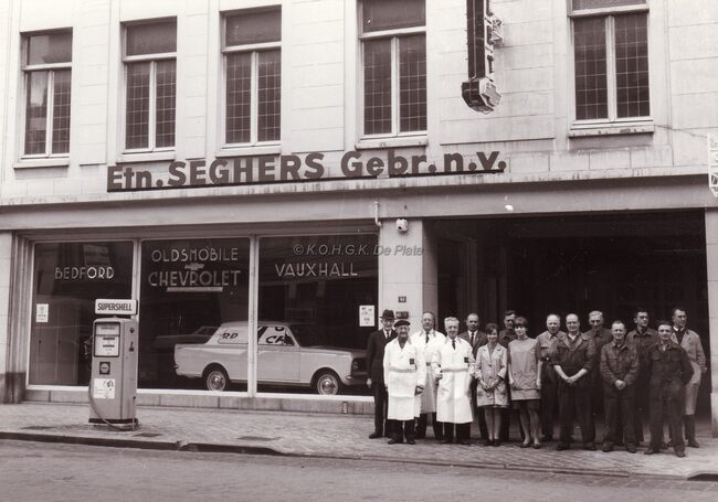 Formaat : 13 x 18 cm. - Etn. Seghers Gebr. n.v. Personeel en directie van garage SEGHERS aan de Torhoutsesteenweg 40, waar zich later de "Boum" bevond. Verdeler van Bedford, Oldsmobile, Chevrolet, Vauxhall.…
