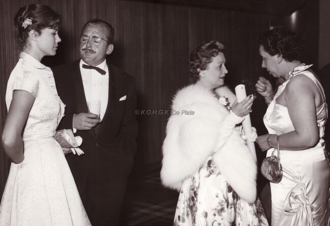 Van links naar rechts, Georgia Moll, Frits Content, mevrouw Van Glabbeke, echtgenote van de burgemeester in gesprek met onbekende dame
