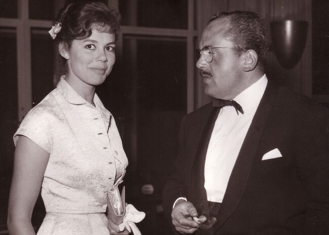 Georgia Moll, Italiaanse filmactrice, in gesprek met Fritz Content tijdens de Feminaprijs voor film in het Kursaal