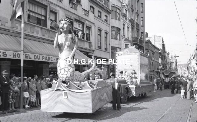 Negatief : 6 x 9 cm. - Stoet naar een ontwerp van kunstschilder Emile Bulcke. Praalwagen nummer 10, op het Marie-Joséplein nabij het hotel "Du Parc". Rechtdoor, de Adolf Buylstraat.