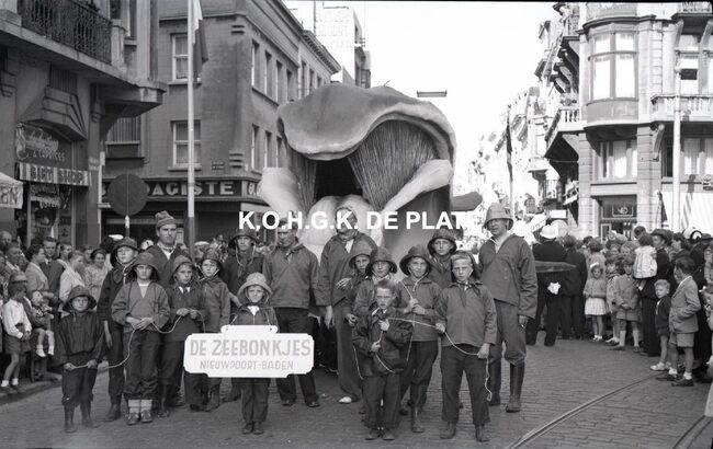 Negatief : 6 x 9 cm. - De folkloristische vereniging "De Zeebonkjes" uit Nieuwpoort-Bad, met hun walvis op het Marie-Joséplein nabij de Adolf Buylstraat