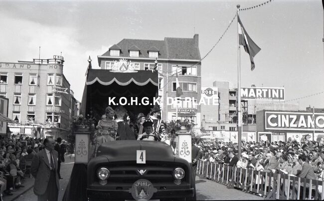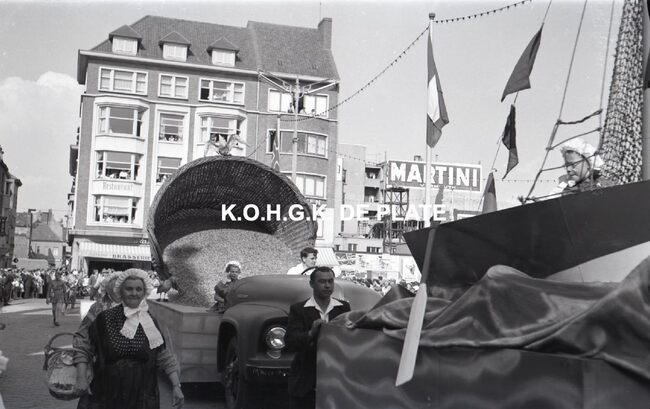 Negatief : 6 x 9 cm. - Stoet naar een ontwerp van kunstschilder Emile Bulcke. Praalwagen op een Ford vrachtauto van de Garage Fernand Stoops op het Marie-Joséplein.