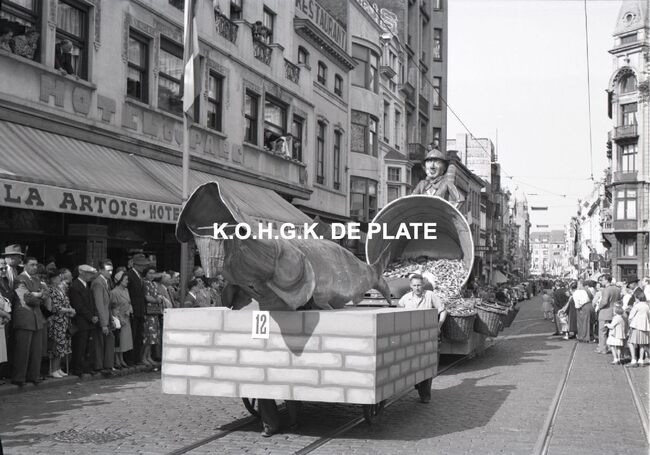 Negatief : 6 x 9 cm. - Stoet naar een ontwerp van kunstschilder Emile Bulcke. Praalwagen nummer 12 op het Marie-Joséplein nabij het hotel "Du Parc".