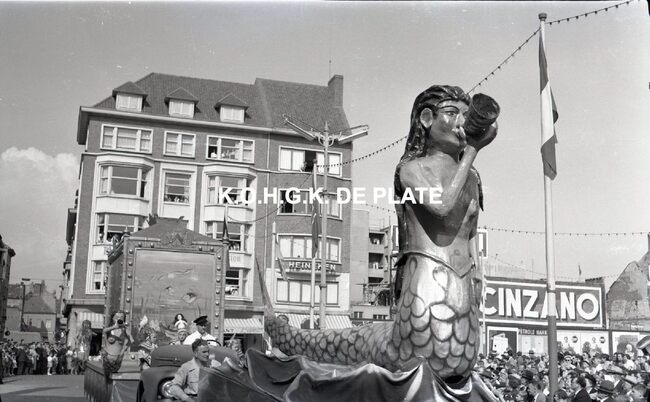 Negatief : 6 x 9 cm. - Stoet naar een ontwerp van kunstschilder Emile Bulcke. Praalwagen nummer 10 "Aquarium" op het Wapenplein.