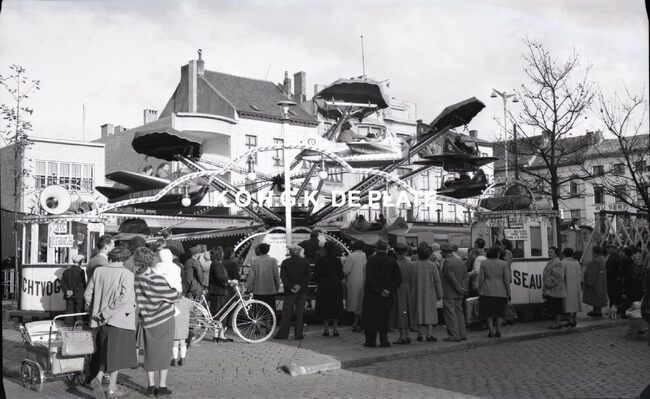 Negatief : 6 x 9 cm. - Stoet naar een ontwerp van kunstschilder Emile Bulcke. Praalwagens op het Marie-Joséplein. Rechtdoor, de Adolf Buylstraat.