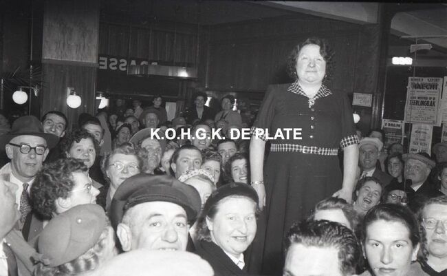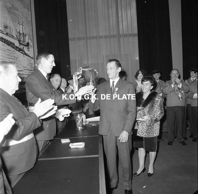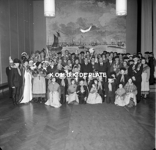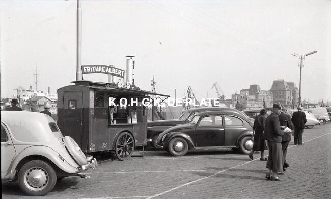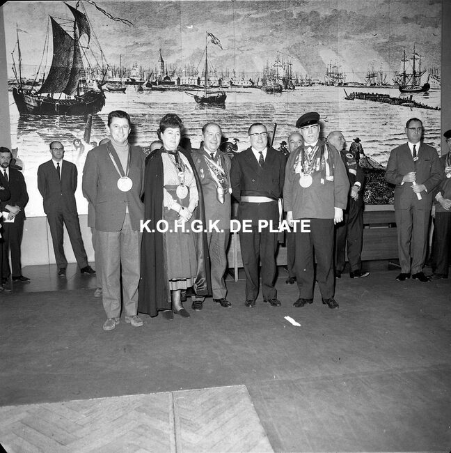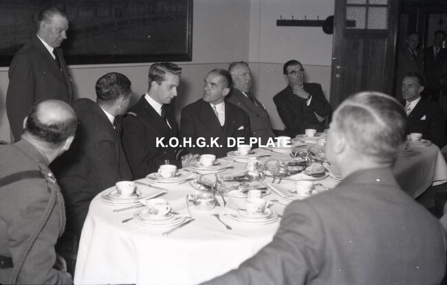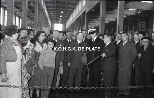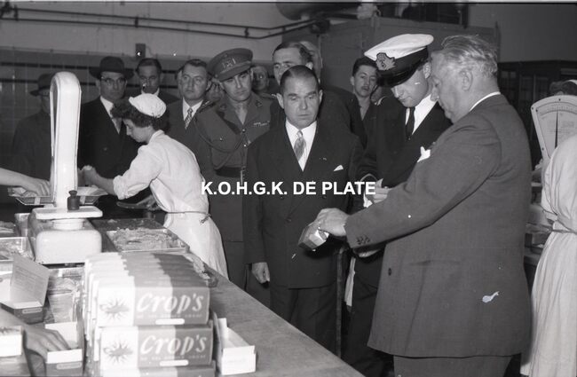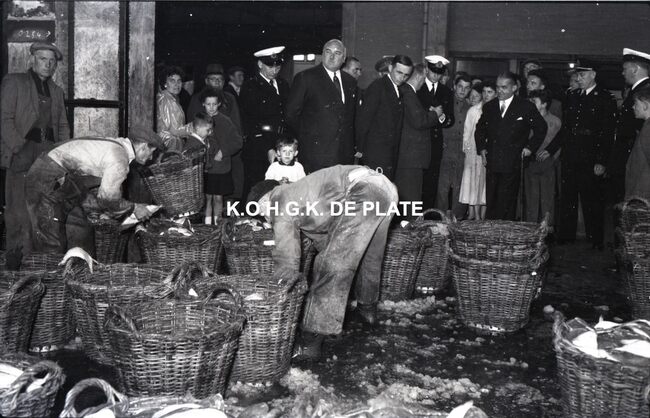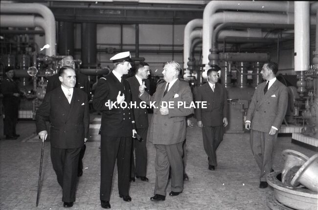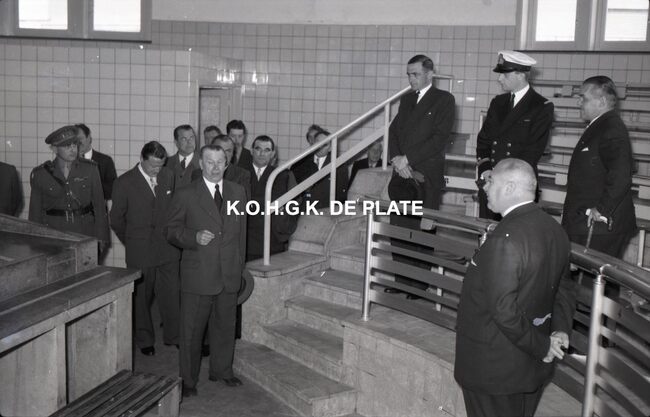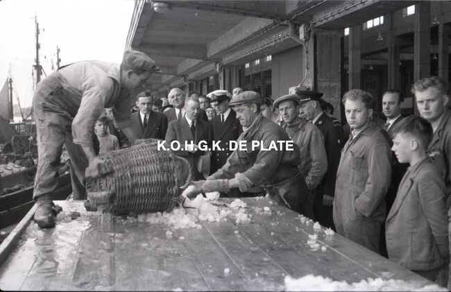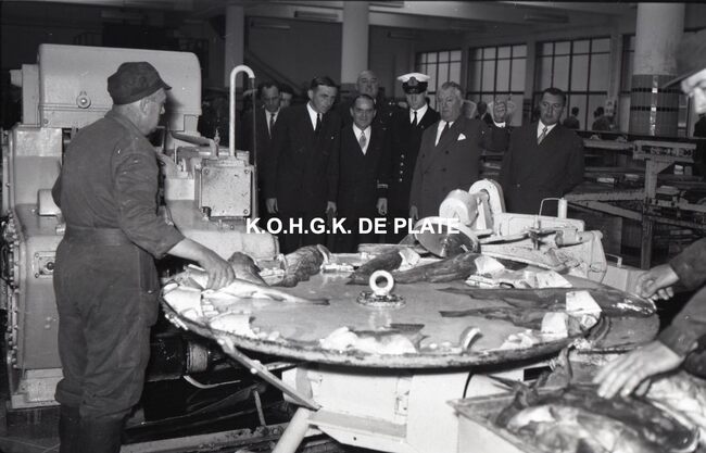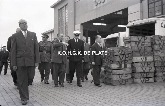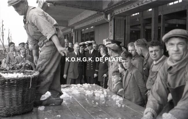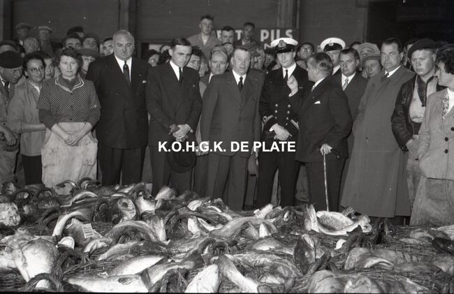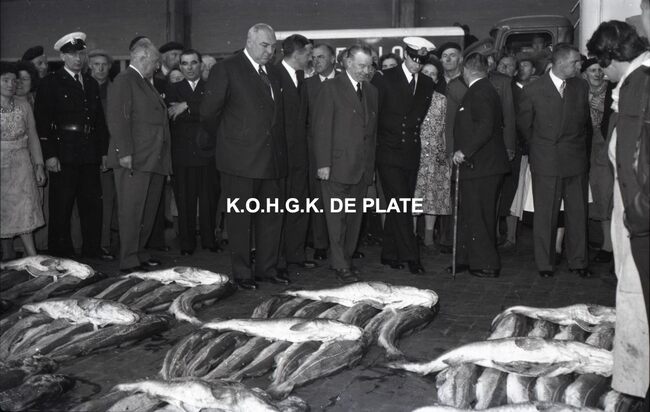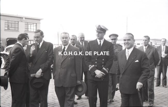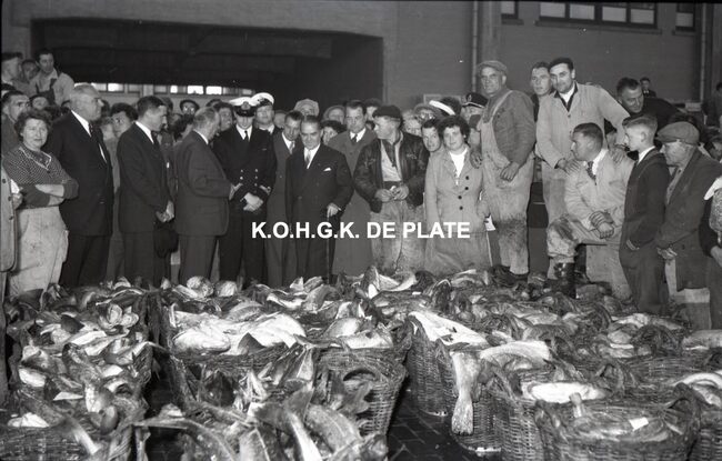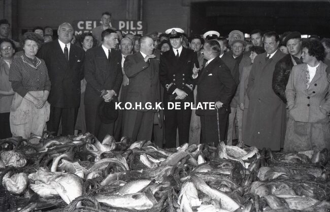 FOTO LUCALBERT II (KONING DER BELGEN)VISMIJN ; ALGEMEENBECU RENE (1900-1967) (HAVENKAPITEIN)HARING- EN SPROTMIJN (VISMIJN)QUAGHEBEUR MAURICE CHARLES (1911-1975) (NOTARIS SCHEPEN)VAN GLABBEKE ADOLPHE (1904-1959) (BURGEMEESTER)VAN OUTRYVE D'YDEWALLE PIERRE (1912-1997) (GOUVERNEUR)VELTHOF GUSTAVE (1893-1972) (DIRECTEUR VISSERSHAVEN)