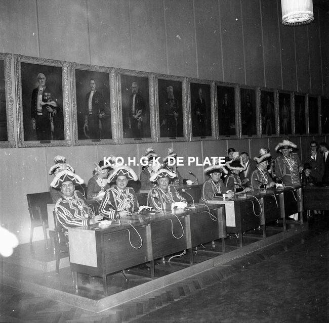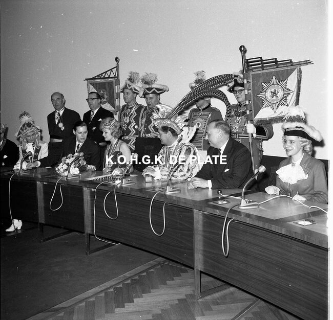 Negatief : 6 x 9 cm. - Ontvangst op het stadhuis. Hier het gevolg van de prins met enkele leden van de "Orde van de Kloeffe" in de raadszaal. In het midden, Blanche Belpaeme en achter haar, Fernand Monteny. Op…