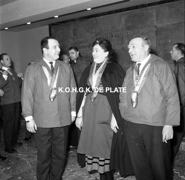 Negatief : 6 x 9 cm. - Ontvangst op het stadhuis. - Ook de "Orde van de Kloeffe" was aanwezig. In het midden, Blanche Belpaeme en Fernand Monteny (rechts). Achteraan, leden van de "Orde van de Garnaal…