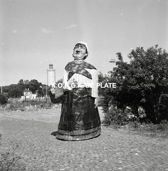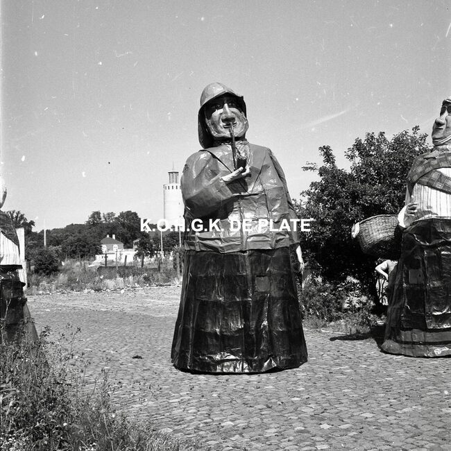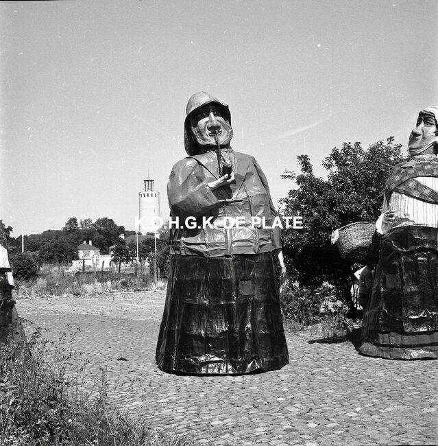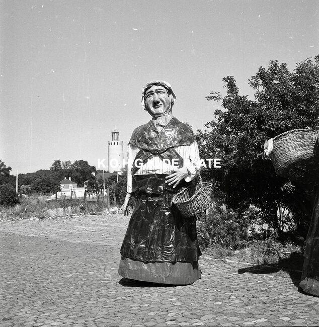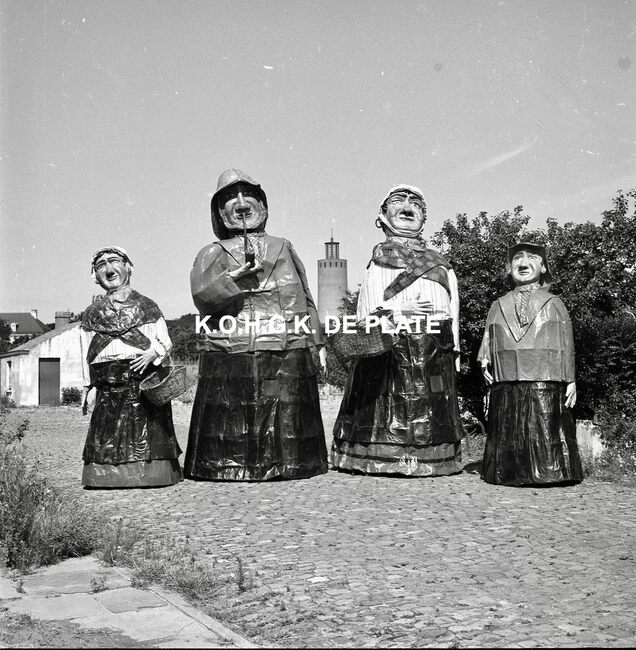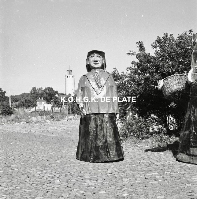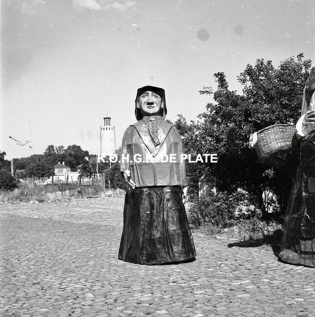 Negatief : 6 x 9 cm. - Van links naar rechts : de Oostendse reuzen Fientje, Tone, Wanne en Tjannie op de terreinen van de Stedelijke Werkhuizen. Op de achtergrond, de watertoren in het Maria-Hendrikapark.