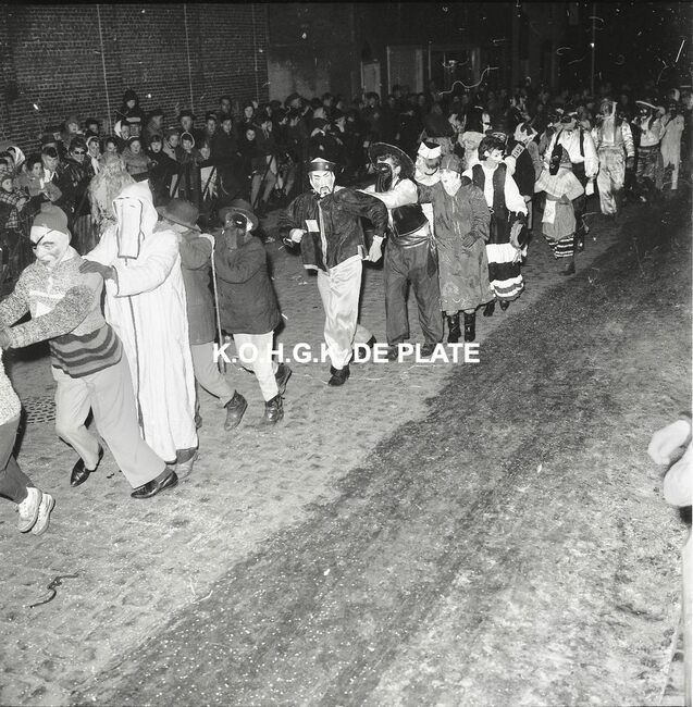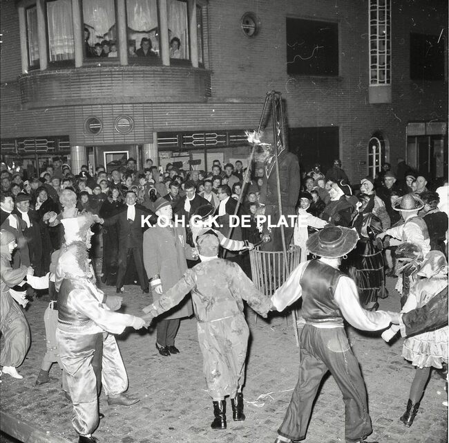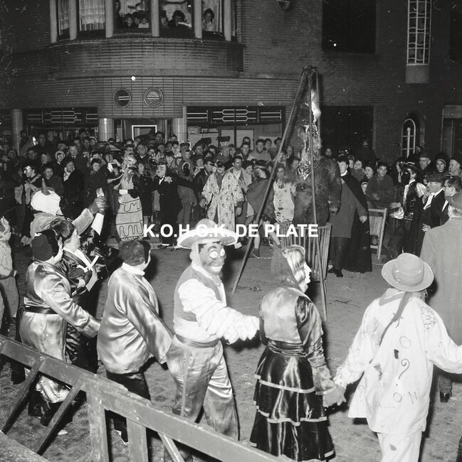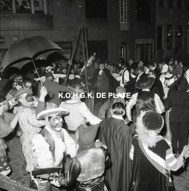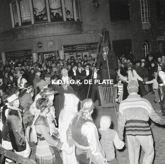 Negatief : 6 x 9 cm. - De pop wordt in brand gestoken door prins Albrecht van Mariakerke 1963. Naast hem prinses Isabella van Mariakerke 1963.