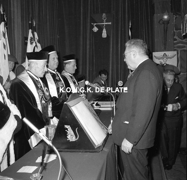 Negatief : 6 x 5,5 cm. - Op de tribune, het prinsenpaar Albrecht en Isabella van Mariakere 1961. Rechts, naast hen, burgemeester Jan Piers en schepen Kamiel Dehouck. Links, Norbert Van der Cruyssen