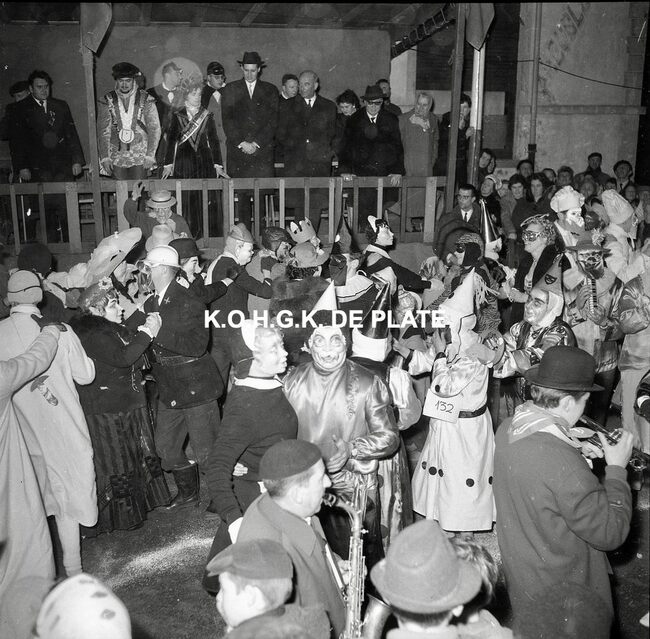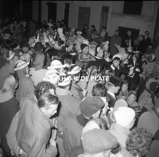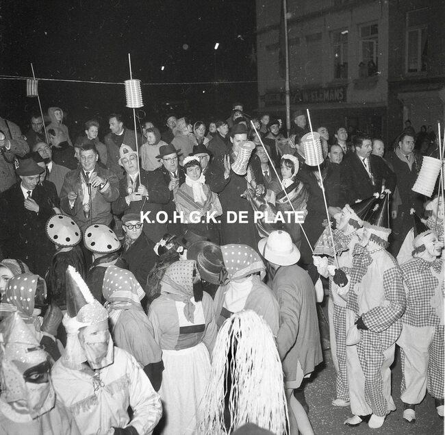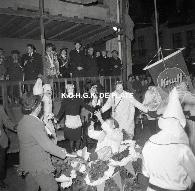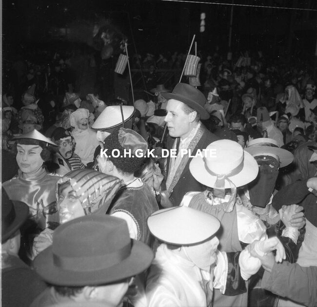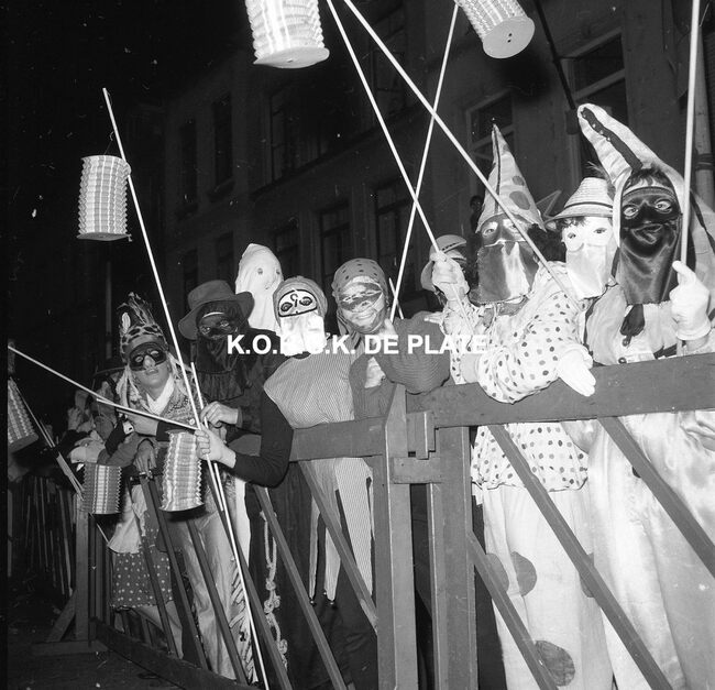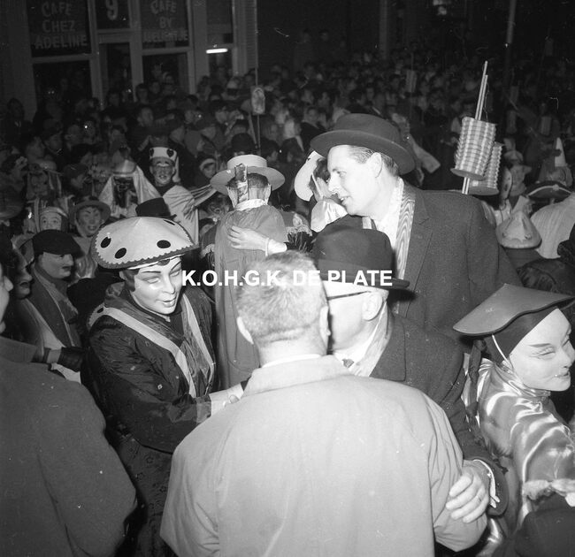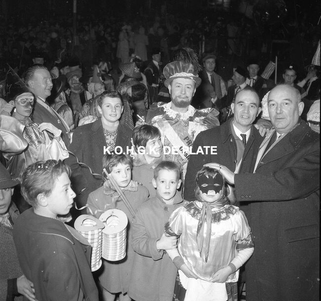 Formaat : 12,5 x 12,5 cm. - Veel gemaskerde carnavalvierders. Op de tribune, het prinsenpaar Albrecht en Isabella van Mariakerke 1961 met rechts van hen, burgemeester Jan Piers en naast hem, schepen, Kamiel Dehouck. Linsk…