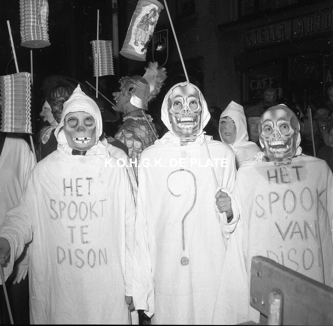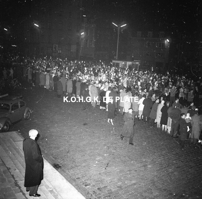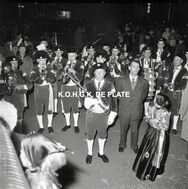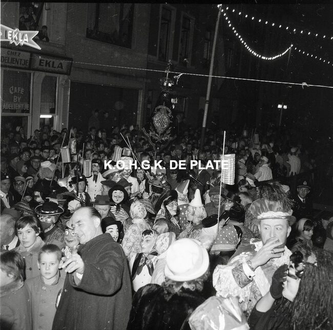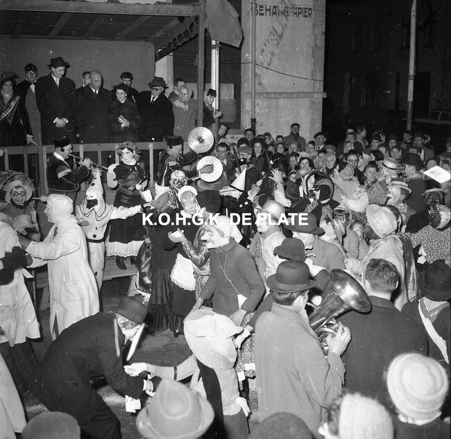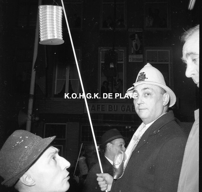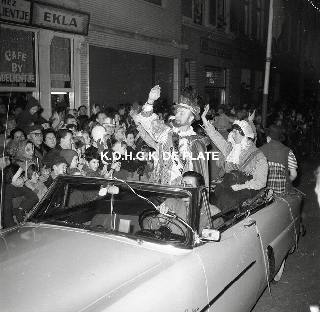 Formaat : 12,5 x 12,5 cm. - Veel gemaskerde carnavalvierders. Op de tribune, het prinsenpaar Albrecht en Isabella van Mariakerke 1961 met rechts van hen, burgemeester Jan Piers en naast hem, schepen, Kamiel Dehouck. Linsk…