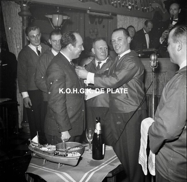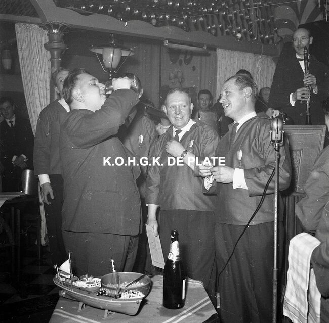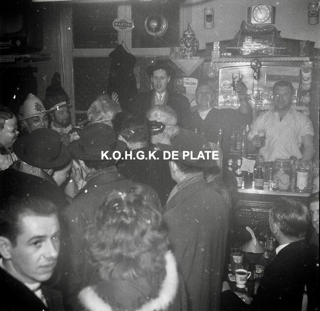 Negatief : 6 x 5,5 cm. - De feestvierders in café "Sonny Boy" langs de Visserskaai. Achter de toog, burgemeester Jan Piers en uitbater Fernand Monteny. De man met de witte helm is Theo Dehaene. Ook de prins…