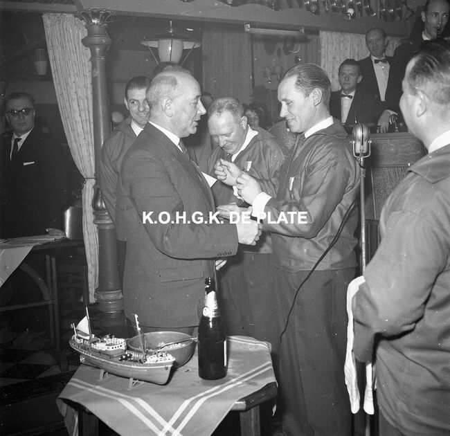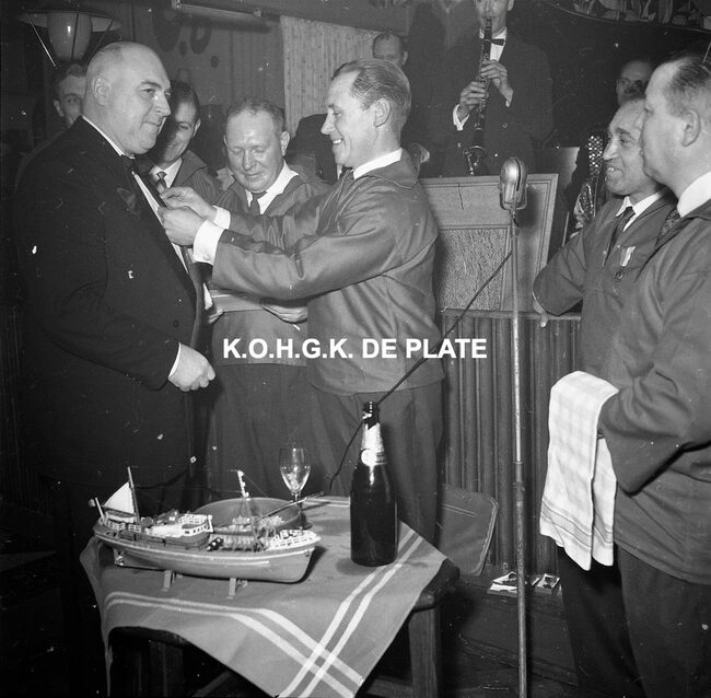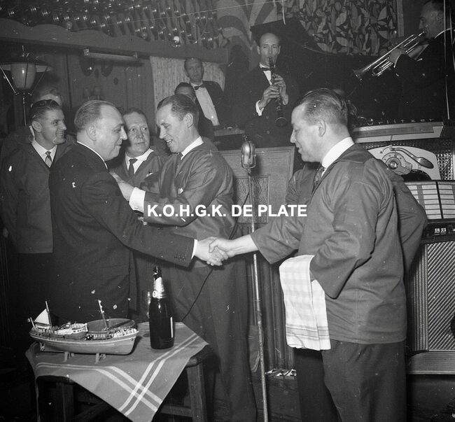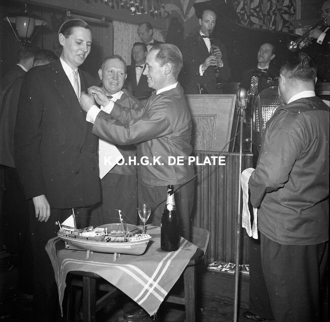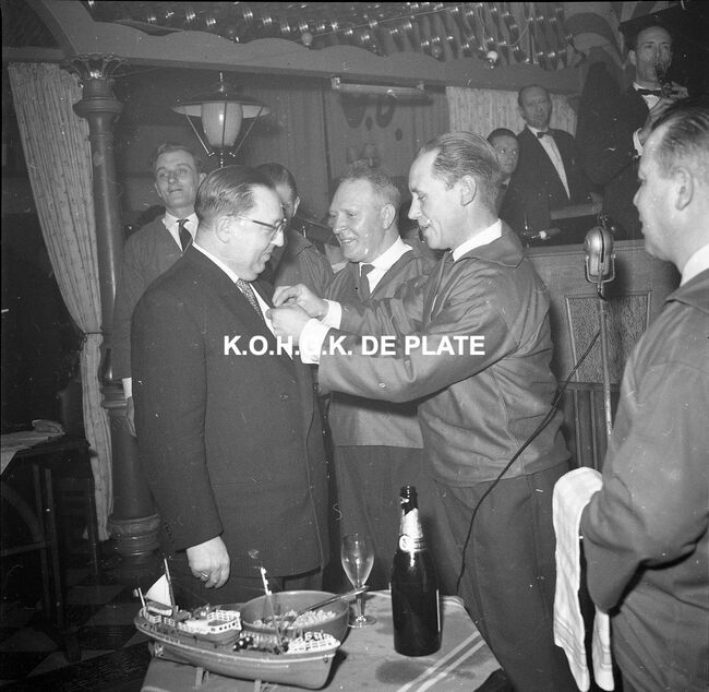Negatief : 6 x 5,5 cm. - Burgemeester Jan Piers wordt lid van de "Orde van de Garnaal". Hier in dancing Carnegie.