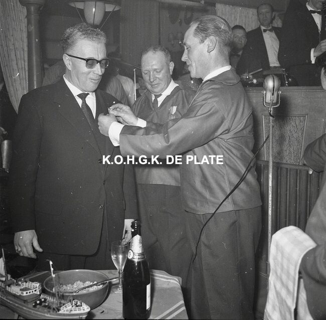 Negatief : 6 x 5,5 cm. - Maurice Quaghebeur sr. wordt lid van de "Orde van de Garnaal". Hier in dancing Carnegie.