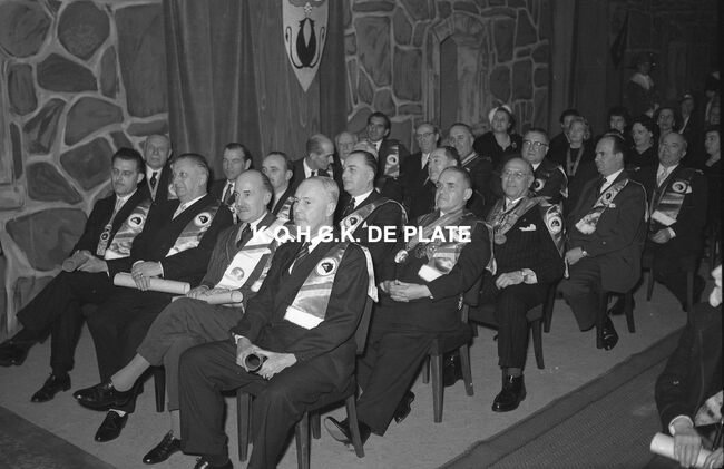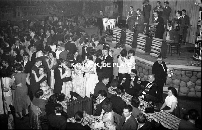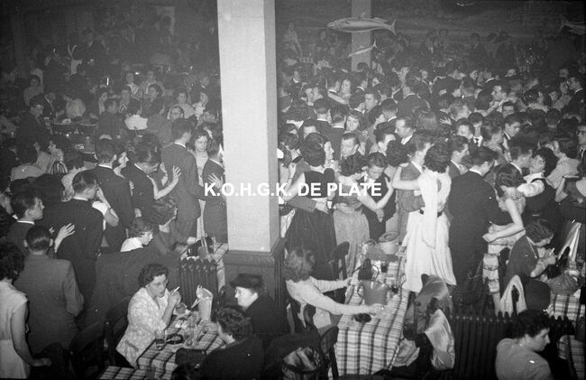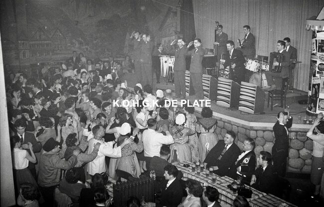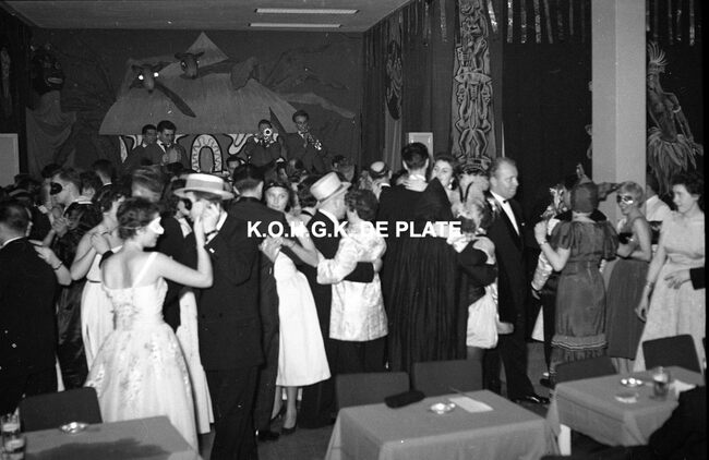 Negatief : 6 x 9 cm. - Altijd ambiance op het Haringbal. Het orkest van Freddy Feys speelt ten dans. Rechts, aan tafel, burgemeester Adolf Van Glabbeke met zijn lint van de Confrerie van de Rat Mort. Straks, moest hij nog…