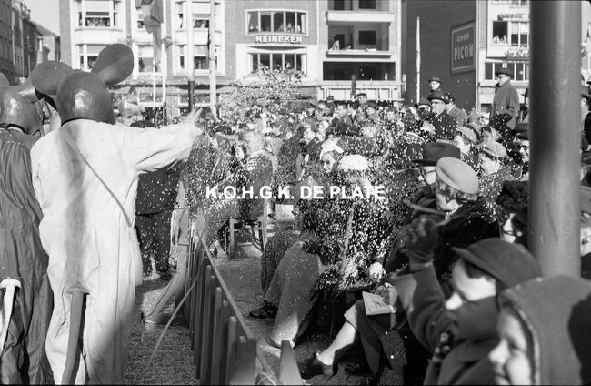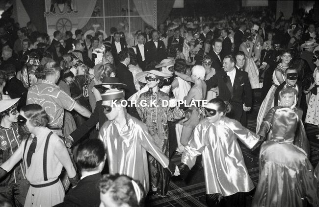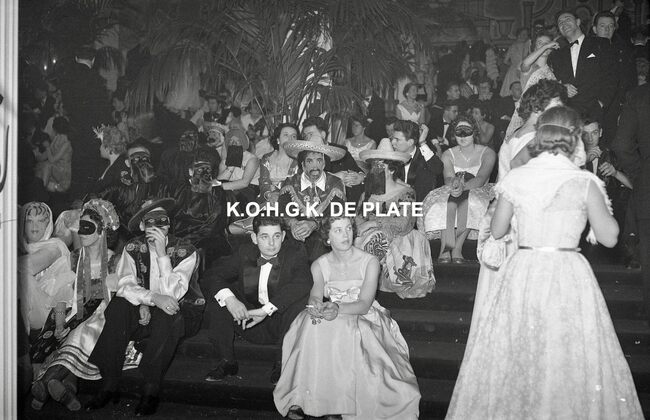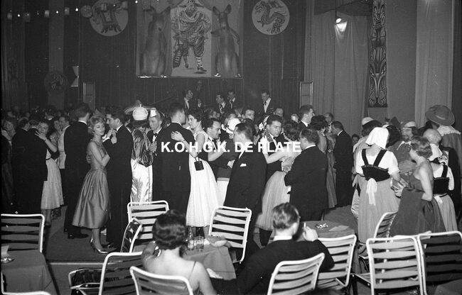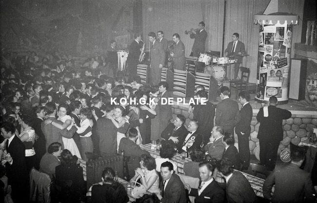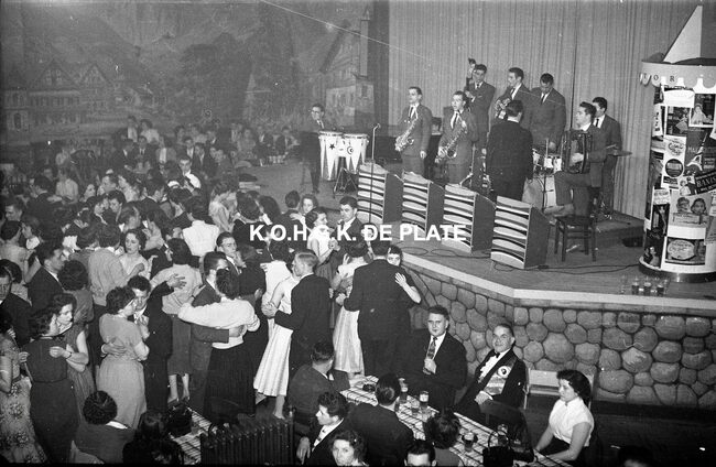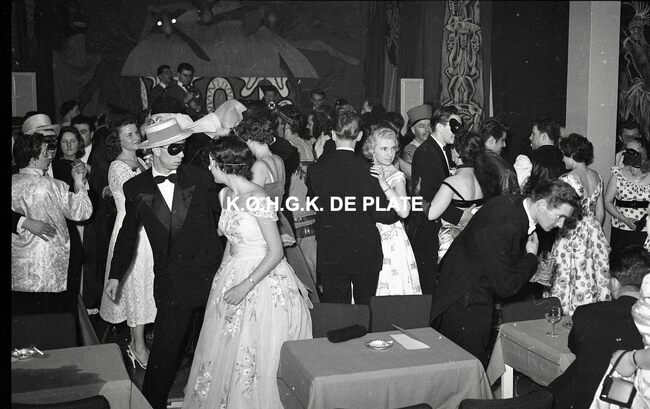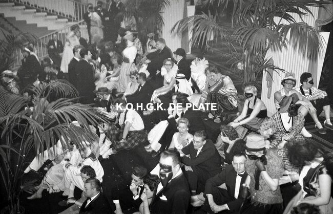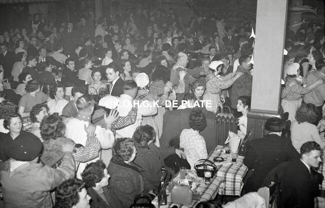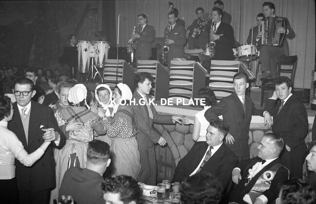 Negatief : 6 x 9 cm. - Zoals altijd was er ambiance op het Haringbal in 't Witte Paard. Rechts, naast die mevrouw, burgemeester Adolf Van Glabbeke en carnavalist Norbert Van der Cruyssen. Het orkest van Freddy Feys…