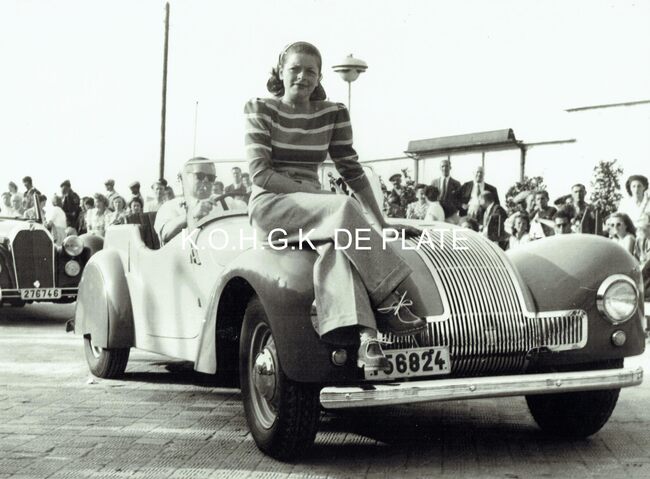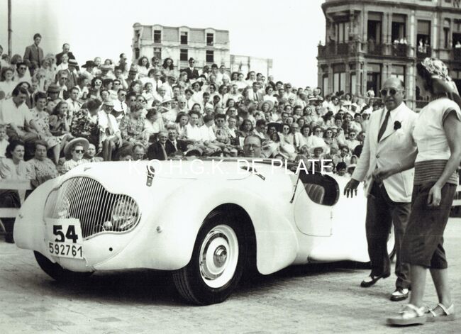Vergroting. - Formaat : 28 x 40 cm. - Elegantiewedstrijd voor auto's op de Albert I-Promenade. Een deelnemer passeert de jury aan de site van het nog niet herbouwde Kursaal. Een sportauto Allard
