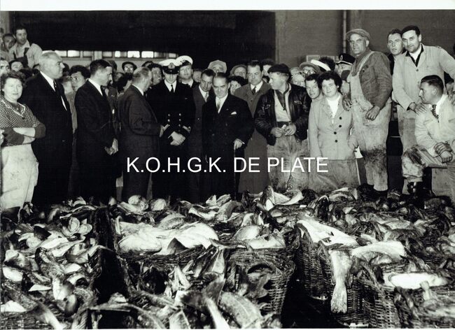 Vergroting. - Formaat : 13 x 18 cm. - Prins Albert op bezoek in de Vismijn tijdens de veiling. Rechts, burgemeester Adolf Van Glabbbeke. Links, schepen Maurice Quaghebeur sr. en naast hem provinciegouverneur Pierre van …
