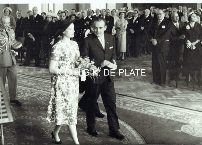 Vergroting. - Formaat : 40 x 28 cm. - Aankomst van de prins en prinses van Monaco op het Wapenplein bij de jumelage Oostende-Monaco. Rechts vooraan stapt burgemeester Adolf Van Glabbeke. Achter de prins loopt schepen Jan…