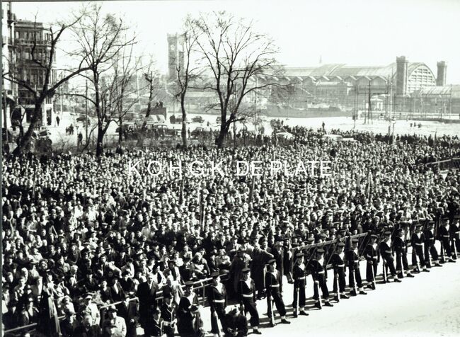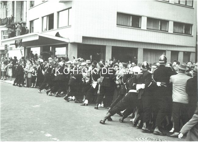 Vergroting. - Formaat : 28 x 40 cm. - De enthousiaste menigte wordt op de hoek van de AlbertI-promenade en de Christinastraat door rijkswachters en zeemachtsoldaten tegenhouden, in afwachting van de doortocht van Prins…
