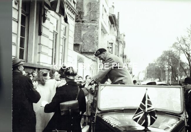 Vergroting. - Formaat : 28 x 40 cm. - Veldmaarschalk Montgomery wordt tijdens zijn eerste bezoek aan Oostende, aan de woning van burgemeester Henri Serruys in de Karel Janssenslaan, begroet door enkele enthousiaste…