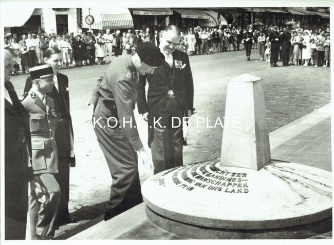 Vergroting. - Formaat : 28 x 40 cm. - Veldmaarschalk Montgomery en burgemeester Adolf Van Glabbeke bij de gedenksteen dat bij zijn eerste bezoek aan de stad in 1948 werd geplaatst. Op de achtergrond hoek Visserskaai en …
