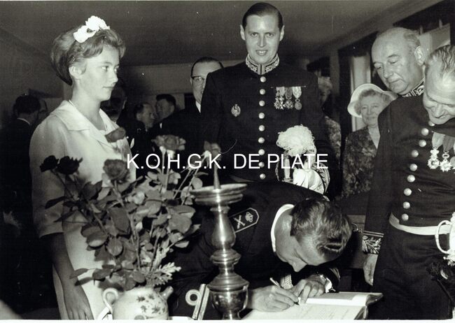 Vergroting. - Formaat : 28 x 40 cm. - Prins Albert tekent het gulden boek van de stad Oostende in de Koninklijke Villa tijdens zijn blijde intrede te Oostende met zijn aanstaande vrouw Prinses Paola. Centraal burgemeester…
