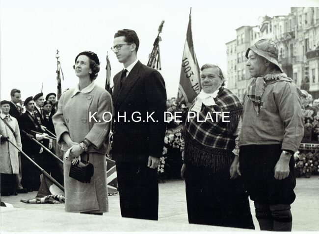 Vergroting. - Formaat : 28 x 40 cm. - Koning Boudewijn en Koningin Fabiola aan het Monument der Zeelieden op het Zeeheldenplein. Naast hen, twee leden van de folkloregroep "De Vismijnvrienden".