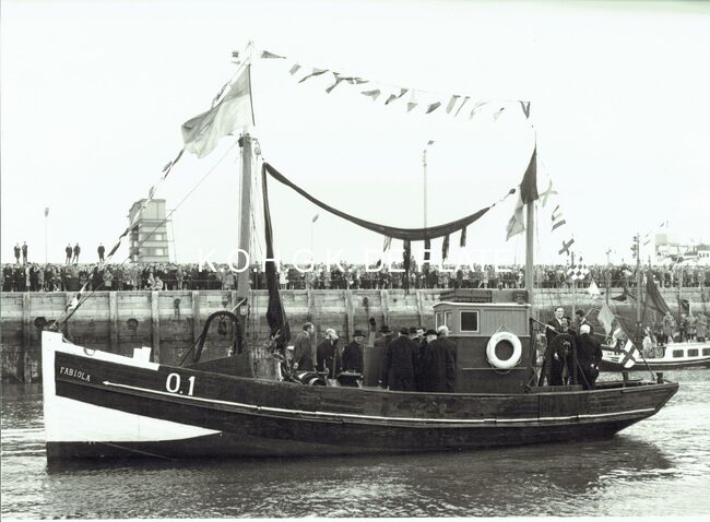 Vergroting. - Formaat : 28 x 40 cm. - Het vissersvaartuig O.1" Fabiola", huwelijksgeschenk van de Stad Oostende aan Koning Boudewijn en Koningin Fabiola, in het Montgomerydok.