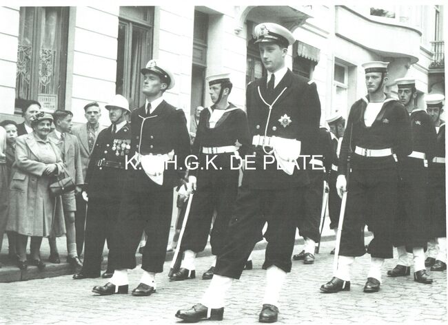 Vergroting. - Formaat : 28 x 40 cm. - Prins Albert op weg naar het Wapenplein, waar hij de eed zal afleggen als Vaandrig ter Zee 2e klas. Links van hem staat Edmond Poullet, de latere Vice-Admiraal. Hier in de Léon…