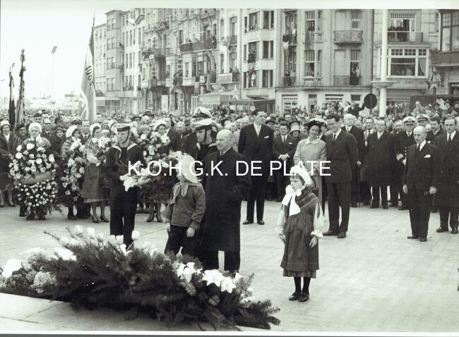 Vergroting. - Formaat : 28 x 40 cm. - Koning Boudewijn en Koningin Fabiola brengen een bloemenhulde aan het Monument der Zeelieden op het Zeeheldenplein. Links van hen, burgemeester Jan Piers. Leden van de…